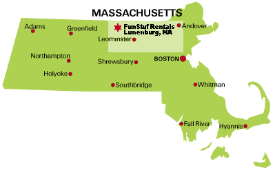 | Our delivery area covers central Massachusetts and southern New Hampshire. If it is a large function utilizing several inflatables, we are willing to travel farther for delivery. For store items, most items are pick-up only. However, some items may be delivered when combined with an inflatable or other large rental. Please contact us for more information. | ||||