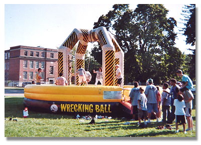 It's the ultimate high-energy inflatable. Four players climb atop their inflatable pads, one player grabs the 'wrecking ball' and hurls it at one of their opponents trying to knock them off their inflatable pad. As the wrecking ball swings back, try to grab it! Once you've got the wrecking ball, you 'rule the roost' and now it's your chance to knock your competitors off their post! Last person standing is the CHAMP! |